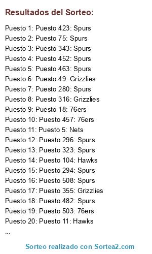 Lista de participantes: Puesto 1: Warriors, Puesto 2: Nets, Puesto 3: Warriors, Puesto 4: Spurs, Puesto 5: Nets, Puesto 6: Spurs, Puesto 7: Spurs, Puesto 8: Spurs, Puesto 9: Spurs, Puesto 10: Spurs, Puesto 11: Hawks, Puesto 12: Spurs, Puesto 13: Hawks, Puesto 14: Spurs, Puesto 15: Spurs, Puesto 16: Spurs, Puesto 17: Grizzlies, Puesto 18: 76ers, Puesto 19: Spurs, Puesto 20: Spurs, Puesto 21: 76ers, Puesto 22: Spurs, Puesto 23: Hawks, Puesto 24: Grizzlies, Puesto 25: Spurs, Puesto 26: Spurs, Puesto 27: Spurs, Puesto 28: Hawks, Puesto 29: Spurs, Puesto 30: Grizzlies, Puesto 31: Hawks, Puesto 32: Grizzlies, Puesto 33: Spurs, Puesto 34: Warriors, Puesto 35: 76ers, Puesto 36: Spurs, Puesto 37: Grizzlies, Puesto 38: Spurs, Puesto 39: 76ers, Puesto 40: Spurs, Puesto 41: Spurs, Puesto 42: Hawks, Puesto 43: Spurs, Puesto 44: Spurs, Puesto 45: Spurs, Puesto 46: Spurs, Puesto 47: Spurs, Puesto 48: Spurs, Puesto 49: Grizzlies, Puesto 50: Warriors, Puesto 51: Spurs, Puesto 52: 76ers, Puesto 53: Hawks, Puesto 54: Hawks, Puesto 55: Spurs, Puesto 56: Spurs, Puesto 57: Spurs, Puesto 58: Spurs, Puesto 59: Warriors, Puesto 60: Nets, Puesto 61: Hawks, Puesto 62: Spurs, Puesto 63: Spurs, Puesto 64: Nets, Puesto 65: Spurs, Puesto 66: Spurs, Puesto 67: Spurs, Puesto 68: Grizzlies, Puesto 69: Spurs, Puesto 70: 76ers, Puesto 71: Grizzlies, Puesto 72: Spurs, Puesto 73: Grizzlies, Puesto 74: Spurs, Puesto 75: Spurs, Puesto 76: Grizzlies, Puesto 77: Warriors, Puesto 78: Warriors, Puesto 79: Grizzlies, Puesto 80: 76ers, Puesto 81: Spurs, Puesto 82: Warriors, Puesto 83: Grizzlies, Puesto 84: Grizzlies, Puesto 85: Spurs, Puesto 86: Spurs, Puesto 87: Spurs, Puesto 88: Nets, Puesto 89: Nets, Puesto 90: Spurs, Puesto 91: Warriors, Puesto 92: Spurs, Puesto 93: Hawks, Puesto 94: Grizzlies, Puesto 95: Nets, Puesto 96: Spurs, Puesto 97: Spurs, Puesto 98: Hawks, Puesto 99: Nets, Puesto 100: Warriors, Puesto 101: Warriors, Puesto 102: Spurs, Puesto 103: Spurs, Puesto 104: Hawks, Puesto 105: Nets, Puesto 106: Spurs, Puesto 107: Spurs, Puesto 108: Spurs, Puesto 109: Spurs, Puesto 110: Nets, Puesto 111: Nets, Puesto 112: Spurs, Puesto 113: Spurs, Puesto 114: 76ers, Puesto 115: Spurs, Puesto 116: Spurs, Puesto 117: Spurs, Puesto 118: Spurs, Puesto 119: Nets, Puesto 120: Spurs, Puesto 121: 76ers, Puesto 122: Hawks, Puesto 123: Hawks, Puesto 124: 76ers, Puesto 125: Spurs, Puesto 126: Hawks, Puesto 127: Grizzlies, Puesto 128: Nets, Puesto 129: Spurs, Puesto 130: Spurs, Puesto 131: Warriors, Puesto 132: Spurs, Puesto 133: Spurs, Puesto 134: Spurs, Puesto 135: Grizzlies, Puesto 136: Warriors, Puesto 137: Warriors, Puesto 138: Spurs, Puesto 139: Spurs, Puesto 140: Spurs, Puesto 141: Spurs, Puesto 142: Nets, Puesto 143: Hawks, Puesto 144: Spurs, Puesto 145: Spurs, Puesto 146: Grizzlies, Puesto 147: Spurs, Puesto 148: Nets, Puesto 149: Spurs, Puesto 150: Spurs, Puesto 151: Hawks, Puesto 152: 76ers, Puesto 153: Spurs, Puesto 154: Warriors, Puesto 155: Spurs, Puesto 156: Warriors, Puesto 157: Spurs, Puesto 158: Nets, Puesto 159: Spurs, Puesto 160: Spurs, Puesto 161: Spurs, Puesto 162: Spurs, Puesto 163: Hawks, Puesto 164: Spurs, Puesto 165: Spurs, Puesto 166: Warriors, Puesto 167: Spurs, Puesto 168: Spurs, Puesto 169: Grizzlies, Puesto 170: Spurs, Puesto 171: Spurs, Puesto 172: Spurs, Puesto 173: Nets, Puesto 174: Spurs, Puesto 175: Nets, Puesto 176: Spurs, Puesto 177: 76ers, Puesto 178: Nets, Puesto 179: Warriors, Puesto 180: Grizzlies, Puesto 181: Nets, Puesto 182: Warriors, Puesto 183: Spurs, Puesto 184: Spurs, Puesto 185: Grizzlies, Puesto 186: Spurs, Puesto 187: 76ers, Puesto 188: Spurs, Puesto 189: 76ers, Puesto 190: Hawks, Puesto 191: Hawks, Puesto 192: Hawks, Puesto 193: Grizzlies, Puesto 194: Warriors, Puesto 195: Spurs, Puesto 196: Spurs, Puesto 197: Hawks, Puesto 198: Spurs, Puesto 199: Spurs, Puesto 200: Spurs, Puesto 201: 76ers, Puesto 202: Spurs, Puesto 203: Nets, Puesto 204: 76ers, Puesto 205: Spurs, Puesto 206: Spurs, Puesto 207: Spurs, Puesto 208: Spurs, Puesto 209: Spurs, Puesto 210: Spurs, Puesto 211: Spurs, Puesto 212: Spurs, Puesto 213: Nets, Puesto 214: Spurs, Puesto 215: Spurs, Puesto 216: Hawks, Puesto 217: Spurs, Puesto 218: Spurs, Puesto 219: Spurs, Puesto 220: Spurs, Puesto 221: Spurs, Puesto 222: Nets, Puesto 223: Spurs, Puesto 224: Spurs, Puesto 225: Spurs, Puesto 226: Nets, Puesto 227: Spurs, Puesto 228: Spurs, Puesto 229: Spurs, Puesto 230: Spurs, Puesto 231: Spurs, Puesto 232: Spurs, Puesto 233: Grizzlies, Puesto 234: Spurs, Puesto 235: Grizzlies, Puesto 236: Spurs, Puesto 237: Grizzlies, Puesto 238: Nets, Puesto 239: 76ers, Puesto 240: Spurs, Puesto 241: Grizzlies, Puesto 242: Spurs, Puesto 243: Hawks, Puesto 244: Spurs, Puesto 245: Warriors, Puesto 246: Spurs, Puesto 247: Spurs, Puesto 248: Nets, Puesto 249: Warriors, Puesto 250: Spurs, Puesto 251: Spurs, Puesto 252: 76ers, Puesto 253: Spurs, Puesto 254: 76ers, Puesto 255: Grizzlies, Puesto 256: Spurs, Puesto 257: Spurs, Puesto 258: 76ers, Puesto 259: Spurs, Puesto 260: Spurs, Puesto 261: Warriors, Puesto 262: Nets, Puesto 263: Nets, Puesto 264: Spurs, Puesto 265: Spurs, Puesto 266: Spurs, Puesto 267: 76ers, Puesto 268: Spurs, Puesto 269: Spurs, Puesto 270: Spurs, Puesto 271: Grizzlies, Puesto 272: Spurs, Puesto 273: Warriors, Puesto 274: Nets, Puesto 275: Spurs, Puesto 276: Spurs, Puesto 277: Spurs, Puesto 278: Spurs, Puesto 279: Grizzlies, Puesto 280: Spurs, Puesto 281: Spurs, Puesto 282: Grizzlies, Puesto 283: Spurs, Puesto 284: Warriors, Puesto 285: Spurs, Puesto 286: Spurs, Puesto 287: Nets, Puesto 288: Spurs, Puesto 289: Nets, Puesto 290: Spurs, Puesto 291: Spurs, Puesto 292: Nets, Puesto 293: Nets, Puesto 294: Spurs, Puesto 295: Spurs, Puesto 296: Spurs, Puesto 297: Nets, Puesto 298: Grizzlies, Puesto 299: Warriors, Puesto 300: 76ers, Puesto 301: Grizzlies, Puesto 302: Spurs, Puesto 303: Grizzlies, Puesto 304: Warriors, Puesto 305: Spurs, Puesto 306: Grizzlies, Puesto 307: Warriors, Puesto 308: Spurs, Puesto 309: Hawks, Puesto 310: Spurs, Puesto 311: 