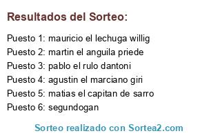 Lista de participantes: martin el anguila priede, segundogan, agustin el marciano giri, pablo el rulo dantoni, mauricio el lechuga willig, matias el capitan de sarro.