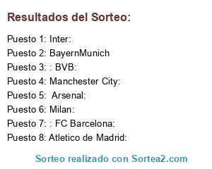 Lista de participantes: : FC Barcelona:, BayernMunich, : BVB: , Manchester City: , Atletico de Madrid:, Arsenal: , Milan: , Inter: .