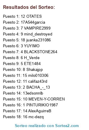 Lista de participantes: 1 PINTURIKIO1987, 2 BACHA_-_13, 3 YUYIMO, 4 BLACKSTONE264, 5 ETE1484, 6 H_Verde, 7 VAMPIRE2999, 8 Shakajpp, 9 mind_destroyed, 10 MEVEN-Y-CORREN, 11 califaz43rd, 12 OTATES, 13edsonnlb, 14 AlexAguirreB, 15 milo010306, 16 mc-dezq, 17A544garcia, 18 juanka231086.