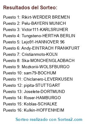 Lista de participantes: Bayern 04 Leverkusen, TSG 1899 Hoffenheim, Borussia Dortmund, FC Schalke 04, FC St. Pauili, SV Werder Bremen, 1. FC Köln, Alumnos, Profesores, FC Bayern München, Apoderados, Hamburg.