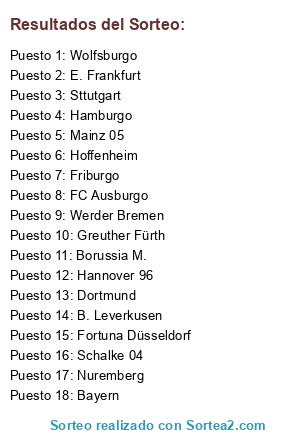 Lista de participantes: Bayern, Dortmund, B. Leverkusen, Schalke 04, E. Frankfurt, Friburgo, Borussia M., Hamburgo, Hannover 96, Mainz 05, Wolfsburgo, Sttutgart, Nuremberg, Werder Bremen, Fortuna Düsseldorf, FC Ausburgo, Hoffenheim, Greuther Fürth.