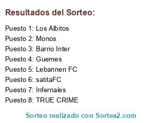 Lista de participantes: Los Albitos, satitaFC, TRUE CRIME, Guemes, Barrio Inter, Lebannen FC, Infernales, Monos.