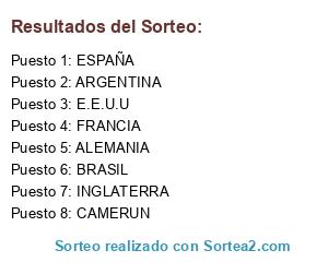Lista de participantes: ESPAÑA, ALEMANIA, FRANCIA, INGLATERRA, BRASIL, ARGENTINA, E.E.U.U, CAMERUN.