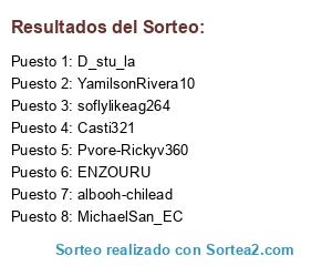 Lista de participantes: jaircisf123, albooh-chilead, Casti321, Manwe22, andspinlla, Williamrenteria, jamesquivel, nyko513, luke_cabj, Exorcista12, frankofv99, watusy84, yamircko, Cris-ChileAD, elBenjo-ChileAD, D_stu_la, MichaelSan_EC, Pvore-Rickyv360, Rolin_house100, soflylikeag264, cristianndavid, ENZOURU, RaiKonR, YamilsonRivera10.