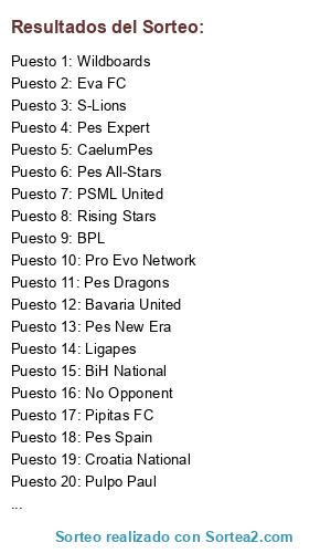Lista de participantes: Balonpes, Bavaria United, BiH National, BPL, CaelumPes, Croatia National, Entregadosalpes, Eva FC, Gossip, Ligapes, Octopus Paul, Pes All-Stars, Pes Dragons, Pes Eleven, Pes Expert, Pes Expert Gladiators, Pes Nation, Pes New Era, Pes Selection, Pes Spain, Pesoholichari, Pipitas FC, Pro Evo Network, PSML United, Pulpo Paul, Rabid Wasps, Rising Stars, Rus Club, S-Lions, Wildboards, No Opponent, No Opponent (2).