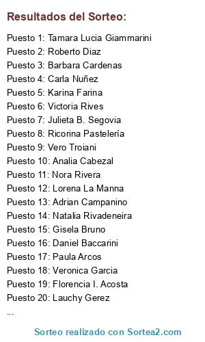 Lista de participantes: carolina Piaggio, Lucrecia Pedreira, Silvina Daniela Jerez, Susana Elizalde, Karren Astola, Julieta Laura Crespi, Lorena Folguera, Marisa Sciombra, Maria Piazzi, Laura Elizabeth, Priscila Denis, Andrea Juncos, Paola Quintana, Carla Nuñez, Noba Invitaciones, Alfredo E. Rocha, Virginia Davis M, Carla Monges Fígoli, Liliana Luján, Luis Firpo, Adriana Marano, Rob Frank, Vero Troiani, Mariel Una Bruja, Daiana Marro, Ale Panu, Hugo Galveni, Daniela Herrera, Karina Farina, Angelica Monterroso, Lorena La Manna, Barbara Cardenas, Nora Rivera, Alejandra Salatino, Mariana Gomez, Daniel Baccarini, Roxy Villordo, Gisela Bruno, Romina Magallanes Lisboa, Leandro Carp, Veronica Liliana Russo, Marina Quintana, Hector Dreiling, Florencia Lattanzio, Barbara Nicholson, María Belén Villalba, Adrian Campanino, Kabezon AB, Dani Giu, Andre Quiroga, Florencia I. Acosta, Roberto Diaz, Julia Currao, Lucas Argañaraz, Victoria Rives, Noelia Currao, Alicia Russo, Lorena D'Eramo, Cintia Burgos Cartes, Juan Alberto Barrera, Lauchy Gerez, Carolina Giselle Gómez Picate, Daniela Santarán, Ricorina Pastelería, Paula Arcos, Paula Noguera, Silvina Ruscio, Maria Laura Russo, Marisa Bertone, Mariela Gomez, Analia Cabezal, Mauricio Greatti, Macarena Diaz, Veronica Garcia, Marilin Aguero, Julieta B. Segovia, Marta Lorena Allora, Tamara Lucia Giammarini, Natalia Rivadeneira.