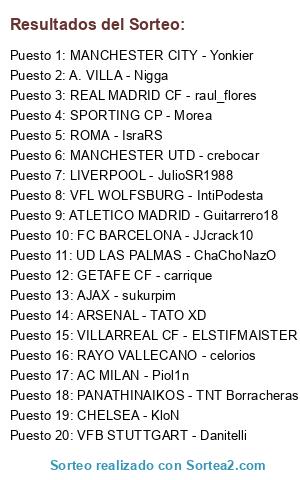 Lista de participantes: AJAX - sukurpim, A. VILLA - Nigga, AC MILAN - Piol1n, ARSENAL - TATO XD, ATLETICO MADRID - Guitarrero18, CHELSEA - KloN, FC BARCELONA - JJcrack10, GETAFE CF - carrique, LIVERPOOL - JulioSR1988, MANCHESTER CITY - Yonkier, MANCHESTER UTD - crebocar, PANATHINAIKOS - TNT Borracheras, RAYO VALLECANO - celorios, REAL MADRID CF - raul_flores, ROMA - IsraRS, SPORTING CP - Morea, UD LAS PALMAS - ChaChoNazO, VFB STUTTGART - Danitelli, VFL WOLFSBURG - IntiPodesta, VILLARREAL CF - ELSTIFMAISTER.