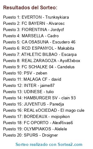 Lista de participantes: ATHLETIC BILBAO - Escarpa, BORDEAUX - mojopikon, CA OSASUNA - Escudero 46, EVERTON - Trunksykiara, FC BAYERN - Alvarosc, FC OPORTO - AlexRivas6, FC SCHALKE 04 - Candelus, FIORENTINA - Jordycf, HAMBURGER SV - clain 93, INTER - jaime87, JUVENTUS - Paredja, MALAGA CF - david, MARSELLA - Cadro, OLYMPIAKOS - Alelele, PSV - zeben, RCD ESPANYOL - Makabita, REAL sOCIEDAD - El mago cule, REAL ZARAGOZA - Ayo83xbox, SPURS - Droigner, UDINESE - tulio.