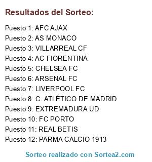 Lista de participantes: AS MONACO, CHELSEA FC, LIVERPOOL FC, C. ATLÉTICO DE MADRID, AFC AJAX, PARMA CALCIO 1913, REAL BETIS, EXTREMADURA UD, ARSENAL FC, VILLARREAL CF, AC FIORENTINA, FC PORTO.
