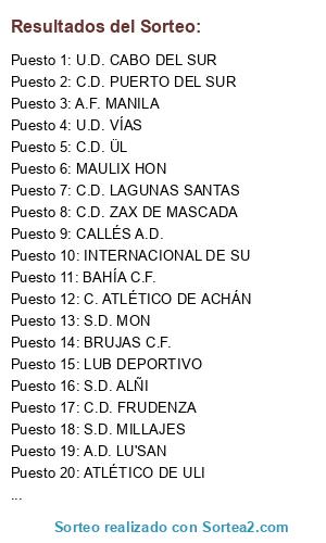Lista de participantes: A.D. LU'SAN, A.F. MANILA, ATLÉTICO DE ULI, BAHÍA C.F., BRUJAS C.F., C. ATLÉTICO DE ACHÁN, C.D. FRUDENZA, C.D. GEYOLAS, C.D. LAGUNAS SANTAS, C.D. PUERTO DEL SUR, C.D. ÜL, C.D. ZAX DE MASCADA, CALLÉS A.D., CIUDAD DE ÚMBAR, INTERNACIONAL DE SU, LUB DEPORTIVO, MAULIX HON, S.D. ALÑI, S.D. MILLAJES, S.D. MON, U.D. CABO DEL SUR, U.D. VÍAS.