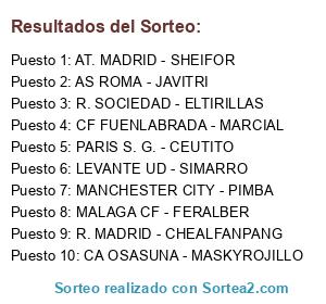 Lista de participantes: AT. MADRID - SHEIFOR, AS ROMA - JAVITRI, PARIS S. G. - CEUTITO, R. SOCIEDAD - ELTIRILLAS, R. MADRID - CHEALFANPANG, CF FUENLABRADA - MARCIAL, MANCHESTER CITY - PIMBA, MALAGA CF - FERALBER, CA OSASUNA - MASKYROJILLO, LEVANTE UD - SIMARRO.
