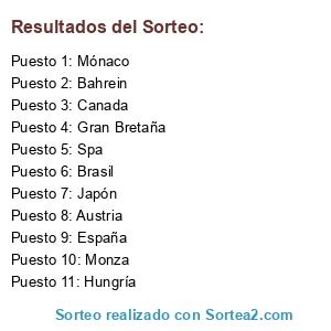 Lista de participantes: Brasil, Hungría, Spa, Gran Bretaña, Austria, España, Japón, Mónaco, Canada, Monza, Bahrein.