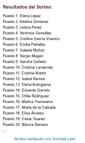 Lista de participantes: Cristina Larraondo, Elena Arangüena, Leticia Perez, Isabel Ramos, Elena López, Verónica González, Adelina Gimenez, Blanca Serrano, Laura Rodrigáñez, Marta de la Calzada, Eduardo Garrido, Emilia Peñalba, Sergio Magan, Cesar Suarez, Cristina Martin, Marina Tremearne, Elisa Álvarez, Isabela Muñoz, Sandra Cañedo, Otilia Rodríguez, Cristina García Vivanco.