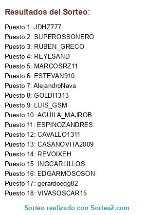 Lista de participantes: ESTEVAN910, GOLDI1313, AGUILA_MAJROB, VIVASOSCAR15, RUBEN_GRECO, INGCARLILLOS, CASANOVITA2009, REVOIXEH, EDGARMOSOSON, ESPINOZANDRES, REYESAND, JDHZ777, LUIS_GSM, MARCOSRZ11, AlejandroNava, gerardoeqg82, SUPEROSSONERO, CAVALLO1311.