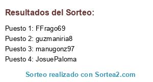 Lista de participantes: sonitroca, perikillo78, cesollas_1, Germamalca, JBRizos, theNBAcircus, daviiiiiiii8, Betica89, FFrago69, MayLuni16, finexpe, esmitnas, otrosvuelos, mochyfroilan, raumat2, mary_rendon_, nclu13, _Dumain_, Enfermereando1, AntonioLlanos6, kekomen, Anacollhomet, crispi08, amontosa, PutoSuspenso, TheJp102, raulmartin115, synbioso, Daviliyo, Agujetitas, panik10, erlolete, MariaVenuss, RoberoJL, TuPonloAqui, menoti23, Cristobal2346, NeonLitght, Girasol_dormido, yayi_1992, pincha_uva, catalinacc55, carferg1, TheViewerClock, Contt22, ConsoleroMan, Exetersev, hualpe1988, CedeTuPrima, Cholosanse, C4Jairus, SendaHorizontal, SamanthaYellow2, vanessaogea, Eulariano, anun01, AreaCiclista, ESCALIBUR1122, CrlswW, mariapekepeke, Rufi00, LauraCartoon, kalatasoy, rafimontavez1, sabato01, the_estructura, sportsc500, topmary01, RietManuel, Jotabe88, Wikyra, SackPlanet, zorna6, HoyPuedeQueSi, JesusLom5, CalderoMagico, DonJavierTwitea, Juanbd97, srjohnwhite97, MitoH_94, SkyRenderx, sorteosgleam_, Funkalicoh, JAGMA94, cristiansotorom, PacoEldelamoto, luquisim091, camacalle, unasentradicas, VictorRCRH, kibirferreiro10, KendrickRemar, Karol_2107, aoslosUH, KanyeSpain, nieves_fm, edumarblan, imperiuum1, MariaBCL1, EspeSuarez, telaringtd, Alvaro1995je, FinaLoCe, Anialbu, alberto___royo, MargaWhite, Sorteos_Top, fraxipar1983, Virgiii_1008, adri199314, A12E93H, Beaglow_, solozzzo, CHONITAVA, Pancons_, Les_lost, slx17, manugonz97, Asuki_chan92, Heryagas, strixgoi, balaidos791, eshg89, universitarious, Jesus_prr, _gregorio23, kikoparedes9, SuperPang666, javividj91, Guille_BvB, FranJareno1, martavalero99, JosuePaloma, Mr_Fdez15, WEONE_1, FernanCardona, alexisromloz, Marikiruiz, Miqui93, pili_mcuevas, maartaa29, guzmaniria8, JuanBGarcia33, javi1117, _iezalel_, andy_J22, SweetLife_22, marybruxa, locurasdekoti, pacopintor1955, spscrazy, IreneAGlez, Kuyet, jmaconde, _danifa_, 12_Daniiiel, AFdezAa, MigAbad_, Alberto8912, Miguel__19_, lapilass1181, corecorequeesde, siempre1181, picotelo2016, lamari1181, vivanlossorteos, davidfaro2005, marianyainhoa, YT_TreW, rustiko2k6, David20676191, amiguel60, Susanatequiere1, laucortes86, alexrayovk, LuciaPeronii, Oscarelpomelo, fartomarcos, maarcosyainhoa, FatiAlQui, Iub71, PalomaAlonso__, ivaan_gl1, sublimadokorro, cepelin0, Diana Bouzas, Nacho Meb, Nando Smith.