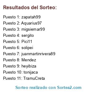 Lista de participantes: zapatah99, sergito, heyibiza, Pici11, Aquarius97, migsiemar99, Mendez, solipei, juanmartinrivera89, TramuCreta, tonijaca.