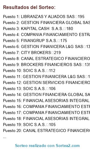 Lista de participantes: SOIC S.A.S. 100, SOIC S.A.S. 101, SOIC S.A.S. 102, SOIC S.A.S. 103, SOIC S.A.S. 104, SOIC S.A.S. 105, SOIC S.A.S. 106, SOIC S.A.S. 107, SOIC S.A.S. 108, SOIC S.A.S. 109, SOIC S.A.S. 110, SOIC S.A.S. 111, SOIC S.A.S. 112, SOIC S.A.S. 113, SOIC S.A.S. 114, GESTION FINANCIERA GLOBAL SAS 115, GESTION FINANCIERA GLOBAL SAS 116, GESTION FINANCIERA GLOBAL SAS 117, GESTION FINANCIERA GLOBAL SAS 118, GESTION FINANCIERA GLOBAL SAS 119, GESTION FINANCIERA GLOBAL SAS 120, GESTION FINANCIERA GLOBAL SAS 121, GESTION FINANCIERA GLOBAL SAS 122, GESTION FINANCIERA GLOBAL SAS 123, GESTION FINANCIERA GLOBAL SAS 124, GESTION FINANCIERA GLOBAL SAS 125, GESTION FINANCIERA GLOBAL SAS 126, GESTION FINANCIERA GLOBAL SAS 127, GESTION FINANCIERA GLOBAL SAS 128, GESTION FINANCIERA GLOBAL SAS 129, GESTION FINANCIERA GLOBAL SAS 130, GESTION FINANICERA L&G SAS 131, GESTION FINANICERA L&G SAS 132, GESTION FINANICERA L&G SAS 133, GESTION FINANICERA L&G SAS 134, GESTION FINANICERA L&G SAS 135, GESTION FINANICERA L&G SAS 136, GESTION FINANICERA L&G SAS 137, GESTION FINANICERA L&G SAS 138, BROCKERS FINANCIEROS SAS 139, BROCKERS FINANCIEROS SAS 140, BROCKERS FINANCIEROS SAS 141, BROCKERS FINANCIEROS SAS 142, BROCKERS FINANCIEROS SAS 143, BROCKERS FINANCIEROS SAS 144, BROCKERS FINANCIEROS SAS 145, BROCKERS FINANCIEROS SAS 146, BPRO PARTNERS SAS 147, BPRO PARTNERS SAS 148, BPRO PARTNERS SAS 149, BPRO PARTNERS SAS 150, BPRO PARTNERS SAS 151, CANAL ESTRATEGICO FINANCIERO COMERCIAL S.A.S 152, CANAL ESTRATEGICO FINANCIERO COMERCIAL S.A.S 153, CANAL ESTRATEGICO FINANCIERO COMERCIAL S.A.S 154, CANAL ESTRATEGICO FINANCIERO COMERCIAL S.A.S 155, CANAL ESTRATEGICO FINANCIERO COMERCIAL S.A.S 156, CANAL ESTRATEGICO FINANCIERO COMERCIAL S.A.S 157, CANAL ESTRATEGICO FINANCIERO COMERCIAL S.A.S 158, CANAL ESTRATEGICO FINANCIERO COMERCIAL S.A.S 159, COMPANIA FINANCIAMIENTO ESTRATEGICO SAS 160, COMPANIA FINANCIAMIENTO ESTRATEGICO SAS 161, COMPANIA FINANCIAMIENTO ESTRATEGICO SAS 162, COMPANIA FINANCIAMIENTO ESTRATEGICO SAS 163, COMPANIA FINANCIAMIENTO ESTRATEGICO SAS 164, COMPANIA FINANCIAMIENTO ESTRATEGICO SAS 165, DELTA CONSULTORES FTD 166, DELTA CONSULTORES FTD 167, DELTA CONSULTORES FTD 168, DELTA CONSULTORES FTD 169, D&D SOLUCIONES FINANCIERAS SAS 170, D&D SOLUCIONES FINANCIERAS SAS 171, D&D SOLUCIONES FINANCIERAS SAS 172, FINANGRUP S.A.S. 173, FINANGRUP S.A.S. 174, FINANGRUP S.A.S. 175, FINANGRUP S.A.S. 176, KAPITAL CASH S.A.S. 177, KAPITAL CASH S.A.S. 178, KAPITAL CASH S.A.S. 179, KAPITAL CASH S.A.S. 180, OUTSOURCING ECONOMIA EFECTIVA SAS 181, OUTSOURCING ECONOMIA EFECTIVA SAS 182, OUTSOURCING ECONOMIA EFECTIVA SAS 183, OUTSOURCING ECONOMIA EFECTIVA SAS 184, GESTION SERVICIOS FINANCIEROS SAS 185, GESTION SERVICIOS FINANCIEROS SAS 186, GESTION SERVICIOS FINANCIEROS SAS 187, GESTION SERVICIOS FINANCIEROS SAS 188, GESTION SERVICIOS FINANCIEROS SAS 189, FINANSER OUTSOURCING SAS 190, FINANSER OUTSOURCING SAS 191, FINANSER OUTSOURCING SAS 192, FINANSER OUTSOURCING SAS 193, LIBRANZAS Y ALIADOS SAS 194, LIBRANZAS Y ALIADOS SAS 195, LIBRANZAS Y ALIADOS SAS 196, FINANCIAL ASESORIAS INTEGRALES S.A.S 197, FINANCIAL ASESORIAS INTEGRALES S.A.S 198, FINANCIAL ASESORIAS INTEGRALES S.A.S 199, FINANCIAL ASESORIAS INTEGRALES S.A.S 200, FINANCIAL ASESORIAS INTEGRALES S.A.S 201, FINANCIAL ASESORIAS INTEGRALES S.A.S 202, CENTRO FINANCIERO DE COLOMBIA SAS 203, CENTRO FINANCIERO DE COLOMBIA SAS 204, CENTRO FINANCIERO DE COLOMBIA SAS 205, CENTRO FINANCIERO DE COLOMBIA SAS 206, CENTRO FINANCIERO DE COLOMBIA SAS 207, MCR SOLUCIONES FINANCIERAS S.A.S. 208, MCR SOLUCIONES FINANCIERAS S.A.S. 209, MCR SOLUCIONES FINANCIERAS S.A.S. 210, MCR SOLUCIONES FINANCIERAS S.A.S. 211, MCR SOLUCIONES FINANCIERAS S.A.S. 212, ESTRATEGIA FINANCIERA SAS 213, CREDITTASA SAS 214, DIMACREDIT SAS 215, RED DE SERVICIOS FINANCIEROS SAS 216, CITY BROKERS 217, CITY BROKERS 218, CITY BROKERS 219.