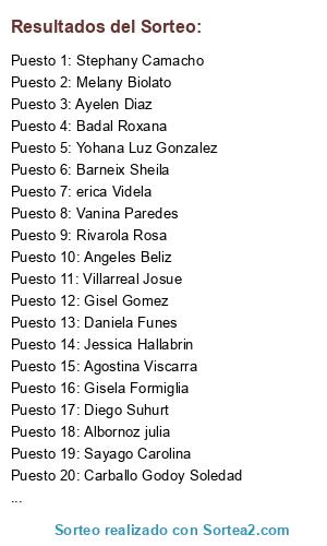 Lista de participantes: Gisel Gomez, Luciana Mansilla, Jacqueline paredes, Florencia Maidana, Melany Biolato, Evelyn Rodriguez, Daniela Ponce, Cielo Urdaniz, Angeles Beliz, Diego Suhurt, Vanina Paredes, Agostina Viscarra, Joana Lucila Gonzalez, Carballo Godoy Soledad, Tamara Machado, Badal Roxana, Paola Bustos, Ayelen Diaz, Marcela GadeA, Jessica Hallabrin, Melina Mladonado, Toane Paola, Obando Sosa Sofia, Schmidt Lucia, Sayago Carolina, Villarreal Josue, Peña Sayes Guadalupe, Rivarola Rosa, Tanya Garay, Iara Alderete, Veronica Flores, Yohana Luz Gonzalez, Lourdes Villega, Dalma Gaitan, Stephany Camacho, Daniela Funes, Zahira Gutierrez, Perez yesica, Rodriguez Daiana, Vasek Silveira, Velasquez Agustina, Brian Rolando, Albornoz julia, Ferreyra ingrid, Ferreyra Brisa, Gisela Formiglia, Vaccarisi Luna, Vilma Robledo, Barneix Sheila, Yanina Aviles, Giuliana Figueredo, erica Videla, schmidt Romina, Nora Bazan.