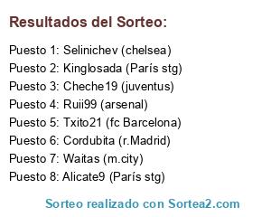 Lista de participantes: Txito21 (fc Barcelona), Alicate9 (París stg), Kinglosada (París stg), Waitas (m.city), Selinichev (chelsea), Cordubita (r.Madrid), Ruii99 (arsenal), Cheche19 (juventus).
