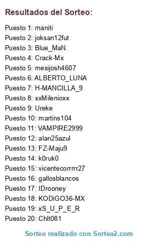 Lista de participantes: xxMilenioxx, maniti, Crack-Mx, KODiGO36-MX, Blue_MaN, k0ruk0, mexijosh4607, joksan12fut, FZ-Maju9, H-MANCILLA_9, martins104, xS_U_P_E_R, Chlt081, vicentecorrrrr27, IDrooney, VAMPIRE2999, alan25azul, Ureke, gallosblancos, ALBERTO_LUNA.