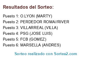 Lista de participantes: PSG (JOSE LUIS), FCB (GOMEZ), VILLARREAL (VILLA), O.LYON (MARTY), MARSELLA (ANDRES), PERDEDOR ROMA//RIVER.