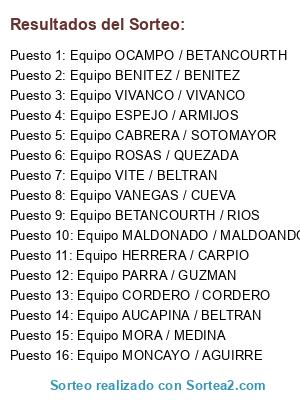 Lista de participantes: Equipo PARRA / GUZMAN, Equipo BETANCOURTH / RIOS, Equipo VITE / BELTRAN, Equipo ESPEJO / ARMIJOS, Equipo CABRERA / SOTOMAYOR, Equipo MONCAYO / AGUIRRE, Equipo AUCAPINA / BELTRAN, Equipo MALDONADO / MALDOANDO, Equipo VANEGAS / CUEVA, Equipo ROSAS / QUEZADA, Equipo CORDERO / CORDERO, Equipo VIVANCO / VIVANCO, Equipo OCAMPO / BETANCOURTH, Equipo MORA / MEDINA, Equipo BENITEZ / BENITEZ, Equipo HERRERA / CARPIO.