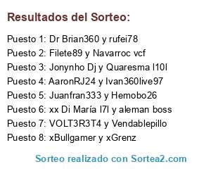 Lista de participantes: Jonynho Dj y Quaresma l10l, VOLT3R3T4 y Vendablepillo, Dr Brian360 y rufei78, xx Di María l7l y aleman boss, Juanfran333 y Hemobo26, xBullgamer y xGrenz, AaronRJ24 y Ivan360live97, Filete89 y Navarroc vcf.