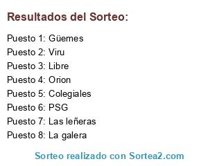 Lista de participantes: Orion, Güemes, Viru, Colegiales, La galera, PSG, Las leñeras, Libre.