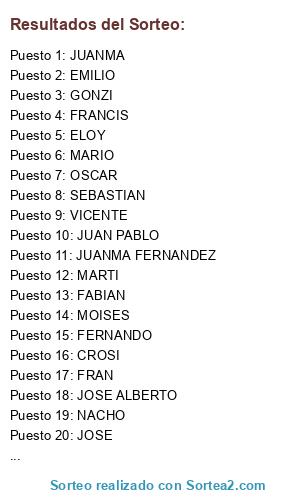 Lista de participantes: CROSI, DANIEL, ELOY, EMILIO, FABIAN, FERNANDO, FRAN, FRANCIS, GONZI, JOSE ALBERTO, JOSE, JUANJO, JUAN ANDRES, JUAN PABLO, JUANMA FERNANDEZ, JUANMA, MARIO, MARTI, MOISES, NACHO, OSCAR, RUBEN, SEBASTIAN, VICENTE.
