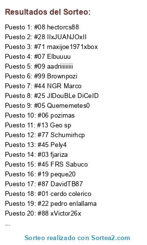 Lista de participantes: #96 Pepitogrillo96, #88 xVictor26x, #11 Fer1959, #25 JIDouBLe DiCeID, #06 pozimas, #28 IIxJUANJOxII, #87 DavidTB87, #77 Schumirhcp, #03 fjariza, #07 Elbuuuu, #05 Quememetes0, #99 lDAVZ, #13 Geo sp, #45 FRS Sabuco, #21 NGR Nalo TT, #44 NGR Marco, #71 maxijoe1971xbox, #99 Brownpozi, #09 aadriiiiiiiii, #08 hectorcs88, #24 Soplillo Sport, #10 Chote, #22 pedro enlallama, #01 cerdo colerico, #45 Pely4, #19 peque20.