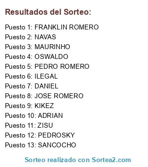 Lista de participantes: NAVAS, PEDRO ROMERO, DANIEL, MAURINHO, ADRIAN, JOSE ROMERO, FRANKLIN ROMERO, KIKEZ, OSWALDO, ZISU, ILEGAL, PEDROSKY, SANCOCHO, SOSA, DAVID.