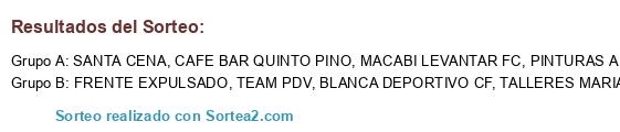 Lista de participantes: CAFE BAR QUINTO PINO, FRENTE EXPULSADO, MACABI LEVANTAR FC, SANTA CENA, BLANCA DEPORTIVO CF, TALLERES MARIANO EXPÓSITO, TEAM PDV, PINTURAS ARROYO CF.