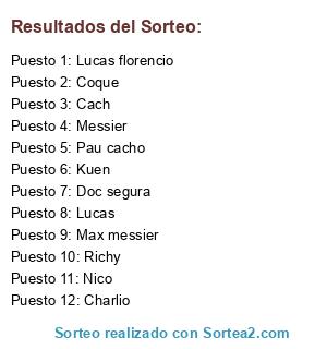 Lista de participantes: Messier, Richy, Kuen, Charlio, Cach, Pau cacho, Doc segura, Lucas florencio, Max messier, Nico, Lucas, Coque.