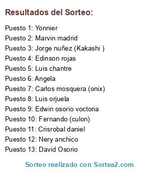 Lista de participantes: Luis orjuela, Angela, Carlos mosquera (onix), Luis chantre, Fernando (culon), Crisrobal daniel, David Osorio, Edinson rojas, Edwin osorio voctoria, Marvin madrid, Nery anchico, Yonnier, Jorge nuñez (Kakashi ).