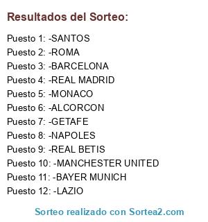 Lista de participantes: -MONACO, -ROMA, -BARCELONA, -NAPOLES, -SANTOS, -REAL BETIS, -GETAFE, -LAZIO, -MANCHESTER UNITED, -BAYER MUNICH, -REAL MADRID, -ALCORCON.