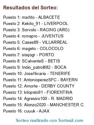 Lista de participantes: Indio_patrol882 - BOCA, Penha69 - CELTIC, toni3_13 - BARCELONA, Agresivo100 - R. MADRID, Amorte - DERBY COUNTY, AntonioperezSFC - BAYERN, Rafa Barba - MILAN, marlito - ALBACETE, enrimabe07 - ANGERS, lakylu - RACING (ESP), peperecre - PSG, DiegoRdz82 - NAPOLES, Sorvolo - RACING (ARG), El_mercu - BASEL, cuuuk - AJAX, Txito21 - DEPORTIVO, Jorgelm7 - GETAFE, Somango10 - SAMPDORIA, mageto - COLOCOLO, fbou90 - GRANADA, M1n3r0 - CHELSEA, Globetrotter - ZARAGOZA, romapro - JUVENTUS, oriolcito11 - MONACO, tete73 - PONFERRADINA, Cadista23 - CÁDIZ, Estupeyonk - VALENCIA, Alboton - PARMA, SCalventeS - BETIS, Kekito_91 - LIVERPOOL, kilopsto91 - FIORENTINA, Kaisser - ATLÉTICO, sisqogr - PORTO, Cartama - MÁLAGA, JoseNivaria - TENERIFE, Masky - OSASUNA, Cases89 - VILLARREAL, Guille_lm - ATHLETIC, jonakny - ZENIT, aLvarofresco - FLAMENGO, Veldraulo - ARSENAL, Carly777 - ROMA, Jliy0 - RIVER PLATE, Jonyho - MANCHESTER U., Xentauros - SEVILLA, Alonzo2020 - MANCHESTER C., Blindcat91 - EXTREMADURA, delsur_cdz - AEK ATENAS.