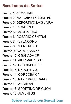 Lista de participantes: CORDOBA CF, DEPORTIVO, FEYENOORD, AC MILAN, SSC NAPOLES, RAYO VALLECANO, R. MADRID, RECREATIVO, ROSARIO CENTRAL, SPORTING DE GIJON, AT.MADRID, GALATASARAY, GRANADA CF, MANCHESTER UNITED, VILLARREAL CF, CA OSASUNA, JUVENTUS, DEPORTIVO LA GUAIRA.