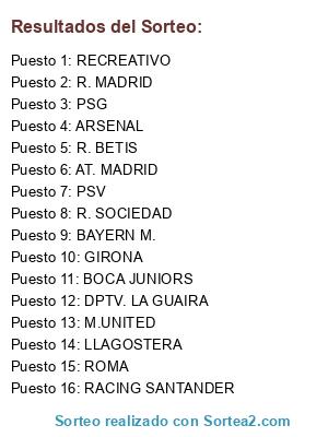 Lista de participantes: RECREATIVO, GIRONA, PSG, PSV, BAYERN M., LLAGOSTERA, R. MADRID, M.UNITED, R. BETIS, AT. MADRID, BOCA JUNIORS, RACING SANTANDER, ARSENAL, DPTV. LA GUAIRA, ROMA, R. SOCIEDAD.