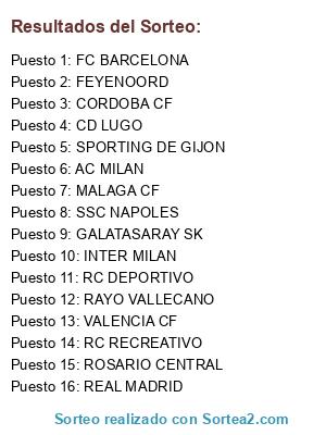 Lista de participantes: FC BARCELONA, RC DEPORTIVO, FEYENOORD, MALAGA CF, SSC NAPOLES, REAL MADRID, RC RECREATIVO, ROSARIO CENTRAL, SPORTING DE GIJON, VALENCIA CF, CORDOBA CF, GALATASARAY SK, INTER MILAN, CD LUGO, AC MILAN, RAYO VALLECANO.