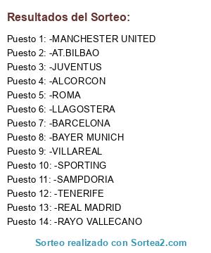 Lista de participantes: -SPORTING, -LLAGOSTERA, -SAMPDORIA, -ROMA, -BARCELONA, -VILLAREAL, -MANCHESTER UNITED, -BAYER MUNICH, -REAL MADRID, -TENERIFE, -ALCORCON, -RAYO VALLECANO, -JUVENTUS, -AT.BILBAO.