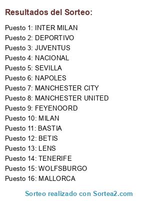 Lista de participantes: FEYENOORD, INTER MILAN, BASTIA, JUVENTUS, BETIS, MALLORCA, MANCHESTER CITY, DEPORTIVO, MANCHESTER UNITED, LENS, MILAN, NACIONAL, NAPOLES, SEVILLA, WOLFSBURGO, TENERIFE.