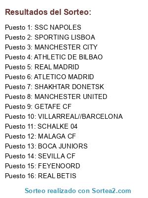 Lista de participantes: ATHLETIC DE BILBAO, GETAFE CF, MALAGA CF, SSC NAPOLES, VILLARREAL//BARCELONA, MANCHESTER CITY, REAL BETIS, BOCA JUNIORS, REAL MADRID, FEYENOORD, SHAKHTAR DONETSK, SEVILLA CF, ATLETICO MADRID, SPORTING LISBOA, MANCHESTER UNITED, SCHALKE 04.