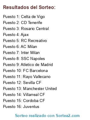 Lista de participantes: Rosario Central, RC Recreativo, SSC Napoles, Celta de Vigo, Atletico de Madrid, FC Barcelona, Sevilla CF, Juventus, Cordoba CF, Inter Milan, Manchester United, Rayo Vallecano, Ajax, Villarreal CF, AC Milan, CD Tenerife.