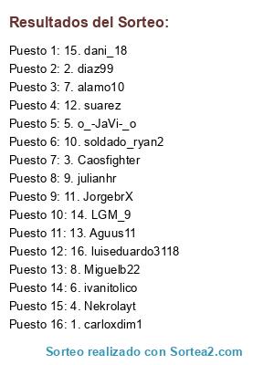 Lista de participantes: 1. carloxdim1, 2. diaz99, 3. Caosfighter, 4. Nekrolayt, 5. o_-JaVi-_o, 6. ivanitolico, 7. alamo10, 8. Miguelb22, 9. julianhr, 10. soldado_ryan2, 11. JorgebrX, 12. suarez, 13. Aguus11, 14. LGM_9, 15. dani_18, 16. luiseduardo3118.