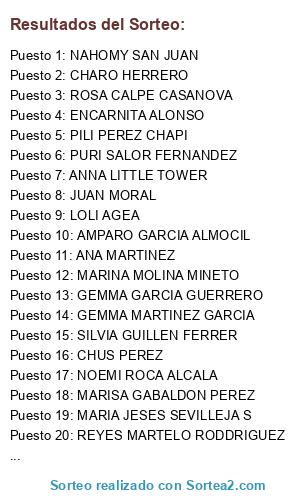 Lista de participantes: ROSA ROSAE, NAHOMY SAN JUAN, SABRINA GOMEZ, MARIA AMPARO ABELLAN GARCIA, VICKY LOPEZ GOMEZ, MARISA GABALDON PEREZ, ANGELES MURCIA GOMEZ, NURIA MARTINEZ FINK, ENCARNITA ALONSO, MIONICA MURCIA SOLER, MANOLI CARCEL, IVANNA LOZANO, JOSE JUST BUY, FALIN SAN JUAN, VERONICA MOYA TOMAS, ANNA LITTLE TOWER, RITA CALVO, CARMEN CRUZ, CHUS PEREZ, ALICIA BEZARES, ROSA COOBAN, FUEGO VARILIO STARK, MIRI MON, PEPI PUGA, ALICIA PORTALES ARAGO, PURI SALOR FERNANDEZ, PILI PEREZ CHAPI, GEMMA GARCIA GUERRERO, NOEMI ROCA ALCALA, ARANCHA AVIÑO HERNANDEZ, MARINA MOLINA MINETO, GEMMA MURCIA, LOLA CALDERON, MARI CARMEN IRANZO PEREZ, CHARO HERRERO, GEMMA MARTINEZ GARCIA, ANA MARTINEZ, MARIA ISABEL SERRANO BUENO, JULIA MURCIA GOMEZ, LA JEFA MOLONA, MARIA JESES SEVILLEJA S, ROSA CALPE CASANOVA, MONICA SIMON PERIS, LOLI AGEA, ENCARNA VALERO MONSALVEZ, JULIA PARDO GARCIA, MADA ALBA MONTIANO, PILAR ROMERO SAIZ, NURIA LAZARO, JULIA MARTINEZ SAIZ, MARINA MALDONADO, SILVIA GUILLEN FERRER, FINA HEREDIA ARIAS, BEGOÑA ZARATE, ELENA TALAVERA, JANA PALAO, JUAN MORAL, BELINDA MARTI, REYES MARTELO RODDRIGUEZ, JOSE LUIS MARTINEZ, AMPARO GARCIA ALMOCIL, ALEJANDRO SAHUQUILLO GARCIA, CELIA RAMIREZ, PEDRO BADIMON PASTOR, RICARDO BAYARRI, .