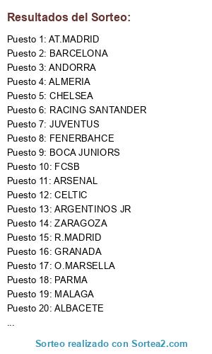 Lista de participantes: MALAGA, BOCA JUNIORS, RACING SANTANDER, GETAFE, FENERBAHCE, RAYO VALLECANO, GRANADA, CELTIC, AC MILAN, ANDORRA, BESIKTAS, AT.MADRID, R.MADRID, ARGENTINOS JR, ARSENAL, CELTA VIGO, ALMERIA, PARMA, ALBACETE, CARTAGENA, BARCELONA, CHELSEA, ZARAGOZA, O.MARSELLA, JUVENTUS, FCSB.