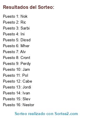 Lista de participantes: Pol, Perdy, Jordi, Sarbi, Ric, Nestor, Ivan, Ini, Alv, Mher, Nok, Cront, Cabe, Jam, Diosd, Slev.