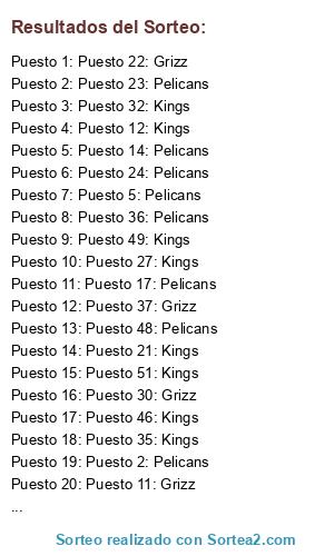 Lista de participantes: Puesto 1: Pelicans, Puesto 2: Pelicans, Puesto 3: Grizz, Puesto 4: Pelicans, Puesto 5: Pelicans, Puesto 6: Grizz, Puesto 7: Pelicans, Puesto 8: Grizz, Puesto 9: Kings, Puesto 10: Pelicans, Puesto 11: Grizz, Puesto 12: Kings, Puesto 13: Grizz, Puesto 14: Pelicans, Puesto 15: Pelicans, Puesto 16: Grizz, Puesto 17: Pelicans, Puesto 18: Pelicans, Puesto 19: Kings, Puesto 20: Grizz, Puesto 21: Kings, Puesto 22: Grizz, Puesto 23: Pelicans, Puesto 24: Pelicans, Puesto 25: Pelicans, Puesto 26: Pelicans, Puesto 27: Kings, Puesto 28: Grizz, Puesto 29: Pelicans, Puesto 30: Grizz, Puesto 31: Grizz, Puesto 32: Kings, Puesto 33: Grizz, Puesto 34: Kings, Puesto 35: Kings, Puesto 36: Pelicans, Puesto 37: Grizz, Puesto 38: Pelicans, Puesto 39: Pelicans, Puesto 40: Pelicans, Puesto 41: Pelicans, Puesto 42: Pelicans, Puesto 43: Grizz, Puesto 44: Pelicans, Puesto 45: Kings, Puesto 46: Kings, Puesto 47: Pelicans, Puesto 48: Pelicans, Puesto 49: Kings, Puesto 50: Pelicans, Puesto 51: Kings.