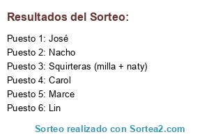 Lista de participantes: Lin, Marce, Nacho, Squirteras (milla + naty), Carol, José.